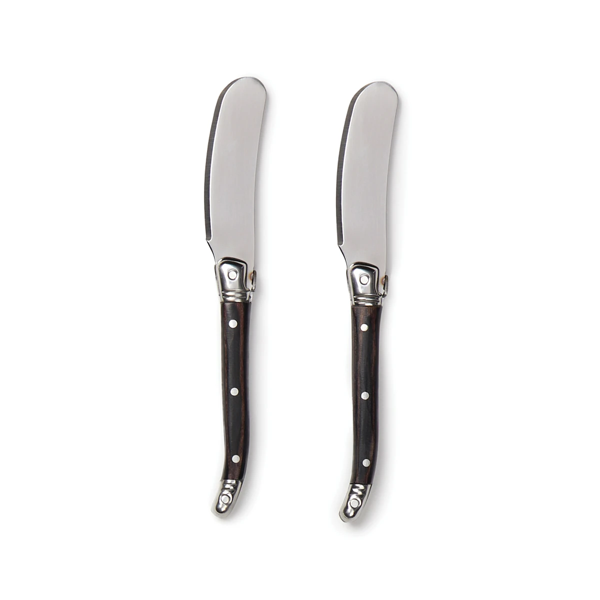 Exclusive 2-piece stainless steel butter knife set. These knives are perfect for spreading butter or jam on toast, bagels, muffins, and more. The high-quality stainless steel blades ensure a smooth, effortless spread, while the sturdy pakka wood handles provide a comfortable grip. The set comes presented in an exclusive gift box, making it an ideal gift for any occasion.
