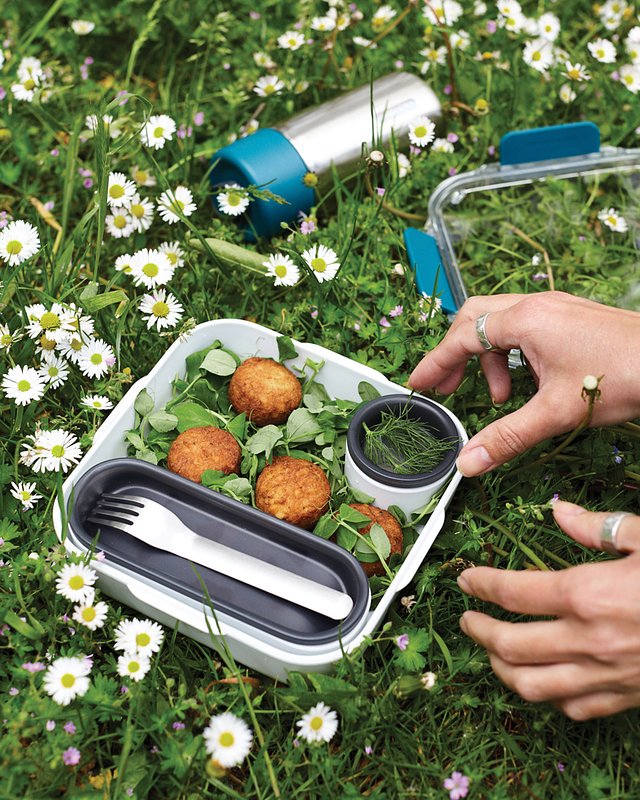 Inspirada en el primer diseño de fiambrera de Black+Blum. Diseñada para parecerse a un tazón de cerámica, la fiambrera incluye un recipiente interior, así como una cacerola antigoteo con un área decorativa en la tapa y un tenedor de acero inoxidable. Apto para microondas y lavavajillas, excepto su tapa de tritan.