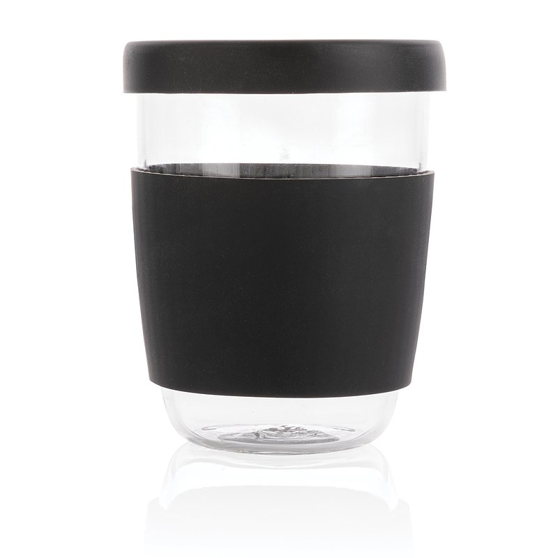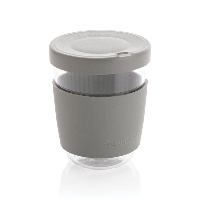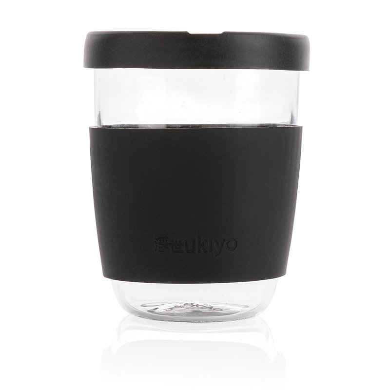 Enjoy your coffee at work or at home in this Ukiyo borosilicate glass with a silicone lid and sleeve. The cup has a good grip and a slim shape. A small ventilation hole in the lid allows steam to escape to prevent pressure build-up. BPA free. 360ml capacity.