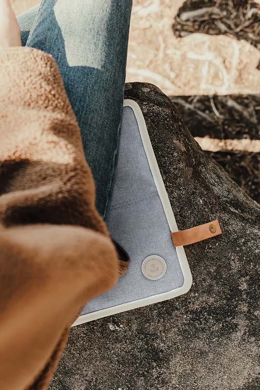 Practical folding seat cushion made with 50% recycled material from PET bottles. Keep it folded with a synthetic leather strap and a snap closure. The strap can be comfortably attached to your backpack.