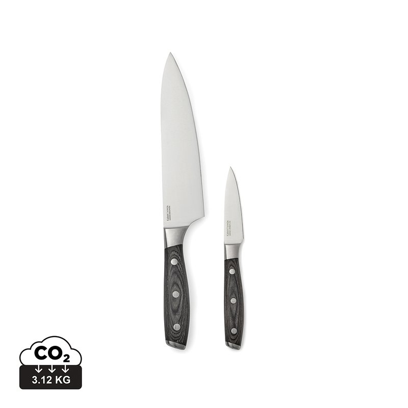 Set of a chef's knife and a vegetable knife. The knives are made from German X50CrMoV15 steel with a Pakkawood handle. The easy-grip handle and excellent blade balance make the knife comfortable and easy to handle. Chef's knife: 20 cm blade. Vegetable knife: 8 cm blade.