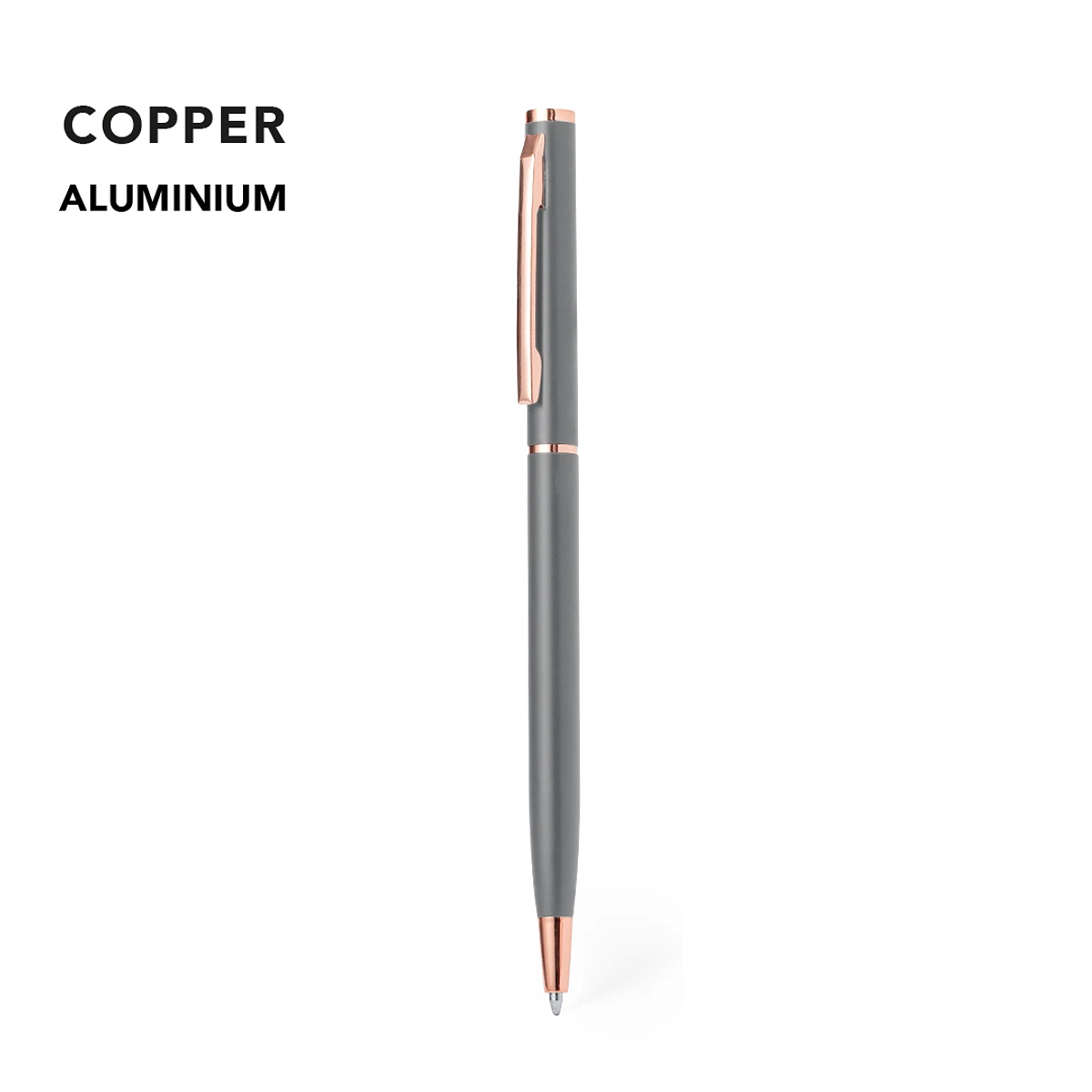 Excelente bolígrafo de aluminio con mecanismo giratorio. Cuerpo en resistente aluminio de acabado mate con elementos decorativos de elegante acabado color cobre, con la caña en una amplia gama de distintivos colores. Clip metálico y de tinta azul. Presentado en una bolsa individual reciclada.