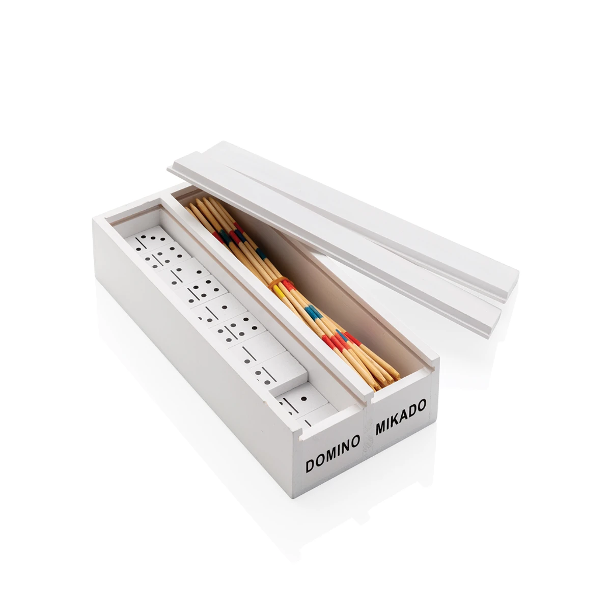 Conjunto de dos juegos vintage recogidos en una caja de MDF. La caja contiene Mikado y Domino. Regala momentos divertidos con estos juegos clásicos. El juego Mikado contiene 41 palos y el juego Domino 28 fichas en una caja con tapa blanca. Viene en caja a todo color.