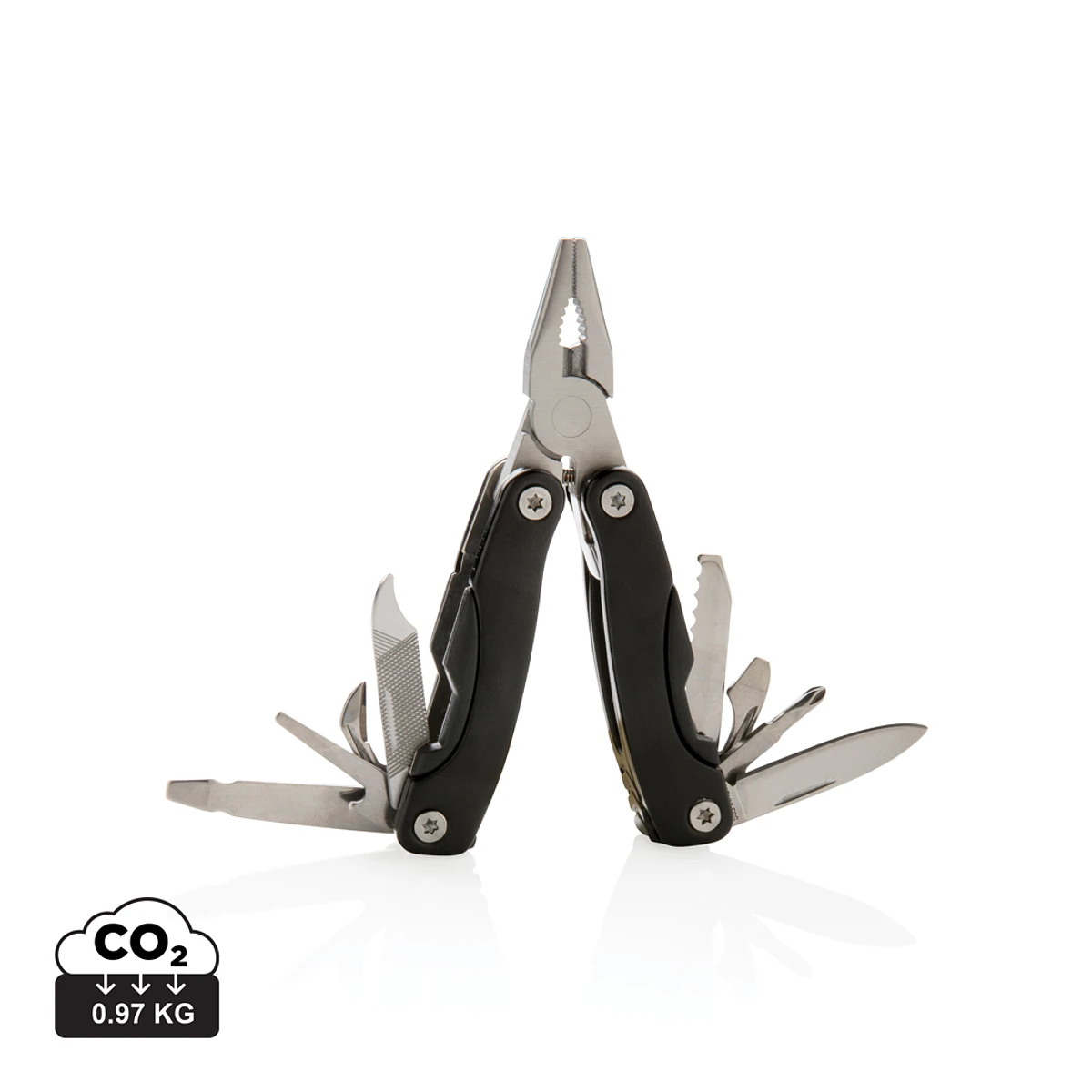 Herramientas de acero inoxidable de 13 funciones y agarre de aluminio anodizado. Incluye funda negra.