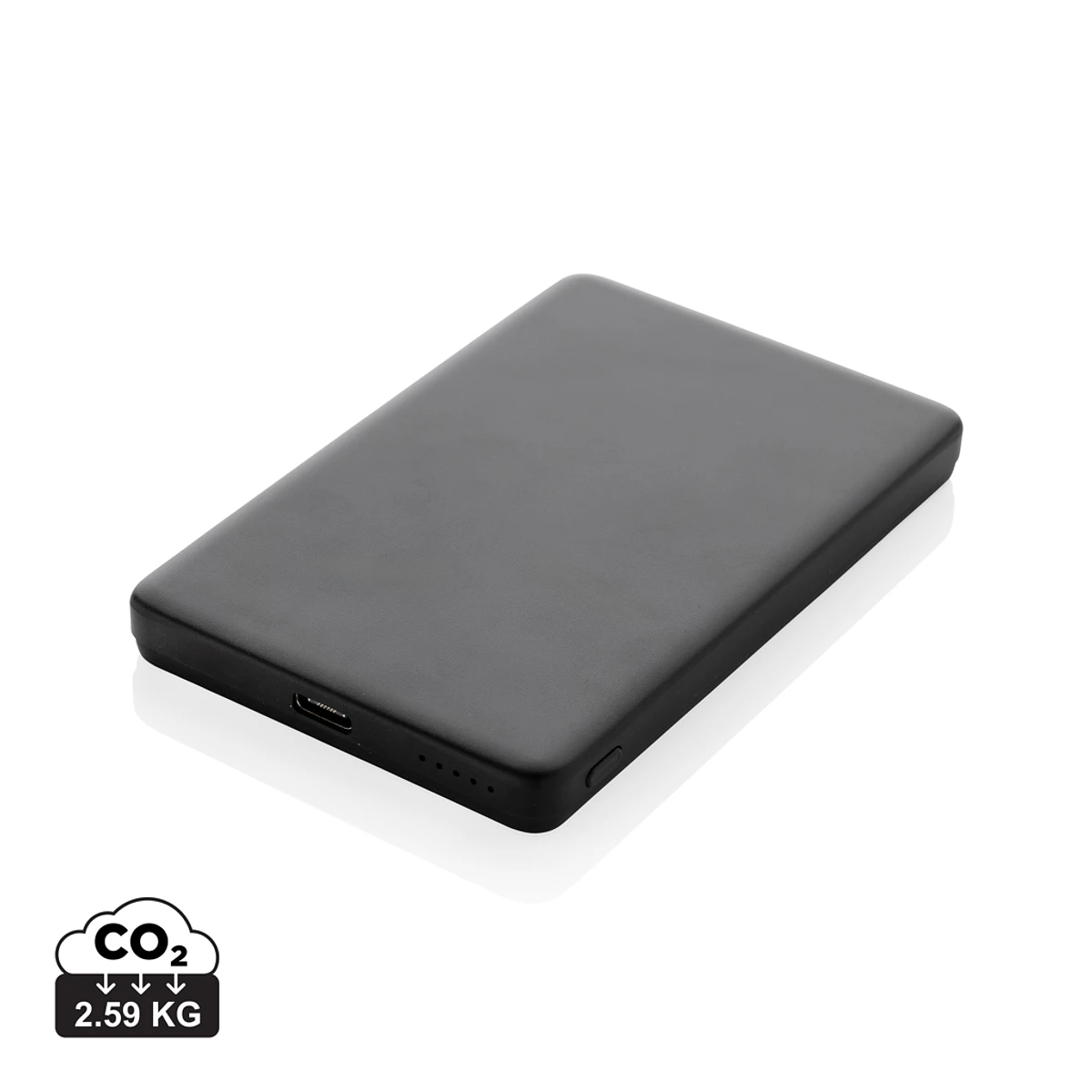 Powerbank ultradelgado de 5.000 mAh con cargador inalámbrico magnético de 5W, cuya carcasa está hecha de aluminio reciclado con certificación RCS y plástico ABS reciclado. RCS (Recycled Claim Standard) es un estándar para verificar el contenido reciclado de un producto a lo largo de toda la cadena de suministro. Contenido reciclado total: 23% en base al peso total del artículo. El powerbank contiene una batería de polímero de litio de grado A de 5.000 mAh de larga duración. Los indicadores de energía indicarán el nivel de energía restante para que siempre sepas cuándo recargar. Entrada tipo C 5 V/2,4 A; Salida USB C: 5 V/2,4 A. Artículo y accesorios libres de PVC. Incluye cable de carga de TPE reciclado con certificación RCS. Presentado en embalaje mixto FSC®.