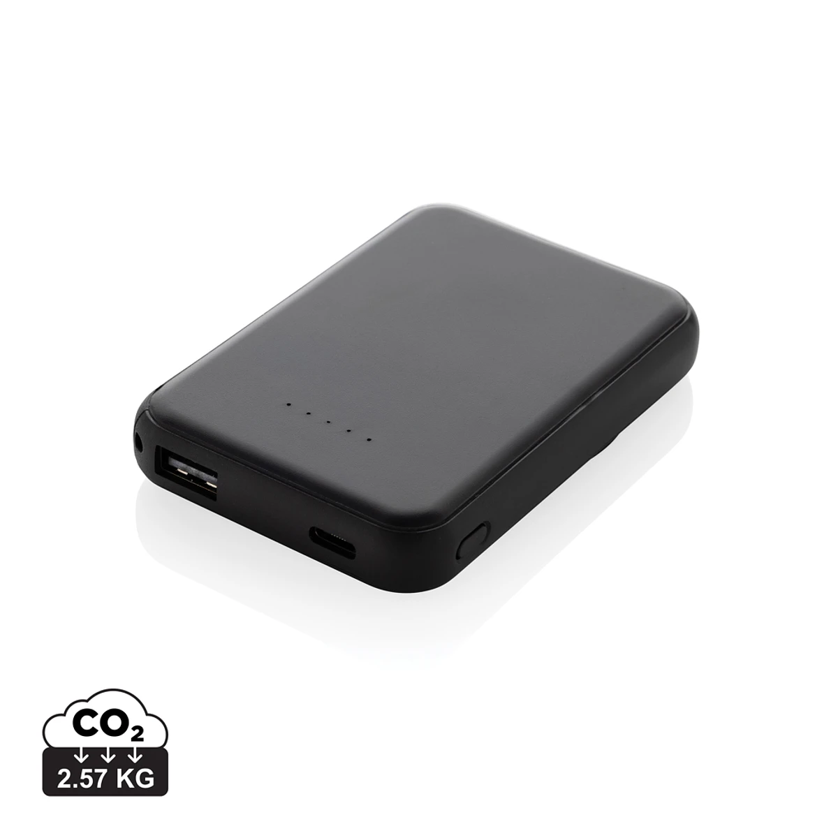Powerbank de bolsillo de 5.000 mAh con cargador inalámbrico magnético de 5W, cuyo estuche está fabricado con plástico ABS reciclado con certificación RCS. RCS (Recycled Claim Standard) es un estándar para verificar el contenido reciclado de un producto a lo largo de toda la cadena de suministro. Contenido reciclado total: 20% en base al peso total del artículo. Con opción de salida USB A y UCB C. El powerbank contiene una batería de polímero de litio de grado A de 5.000 mAh de larga duración. Los indicadores de energía indicarán el nivel de energía restante para que siempre sepas cuándo recargar. Entrada tipo C 5 V/2,4 A; Salida USB C/USB A: 5 V/2,4 A. Artículo y accesorios libres de PVC. Incluye cable de carga TPE reciclado con certificación RCS. Presentado en embalaje mixto FSC®.