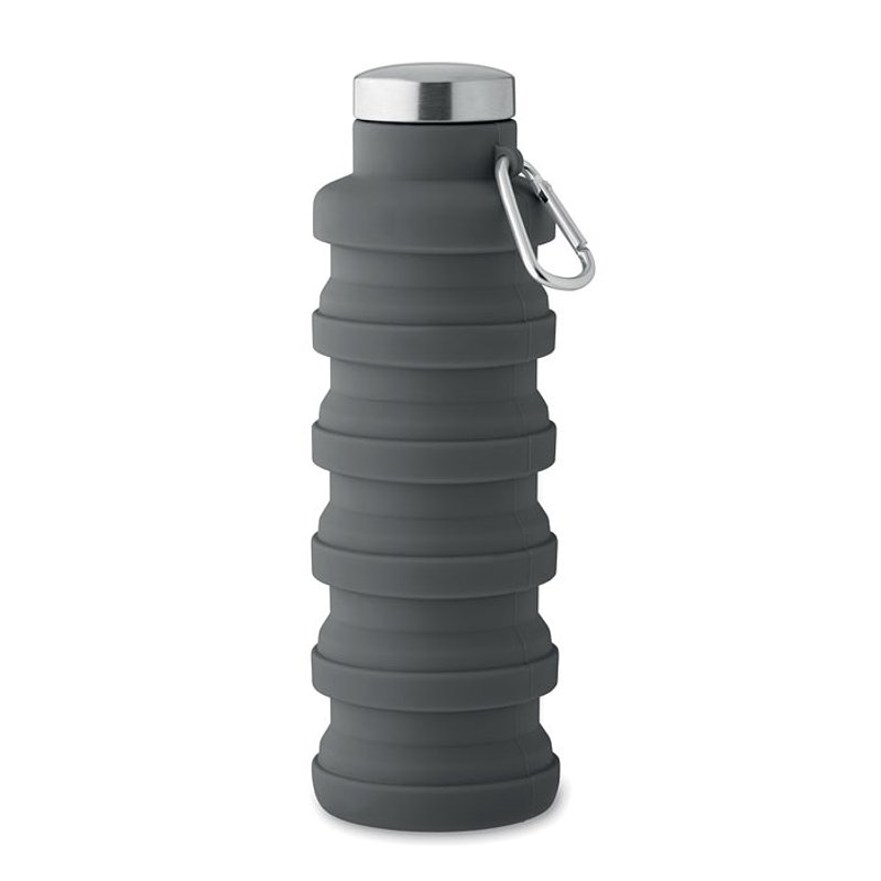 Botella plegable de silicona con tapa de acero inoxidable y mosquetón de aluminio. El mosquetón no es para escalada (uso no profesional). Capacidad: 500 ml.
