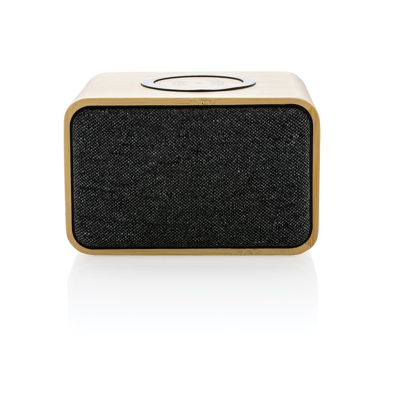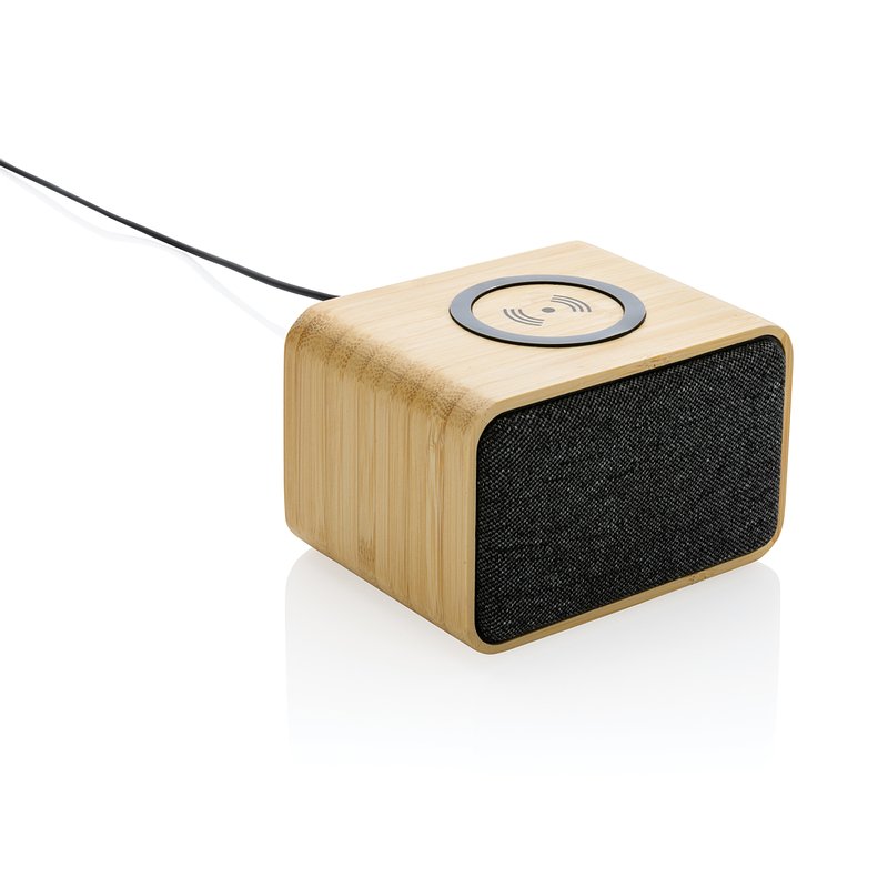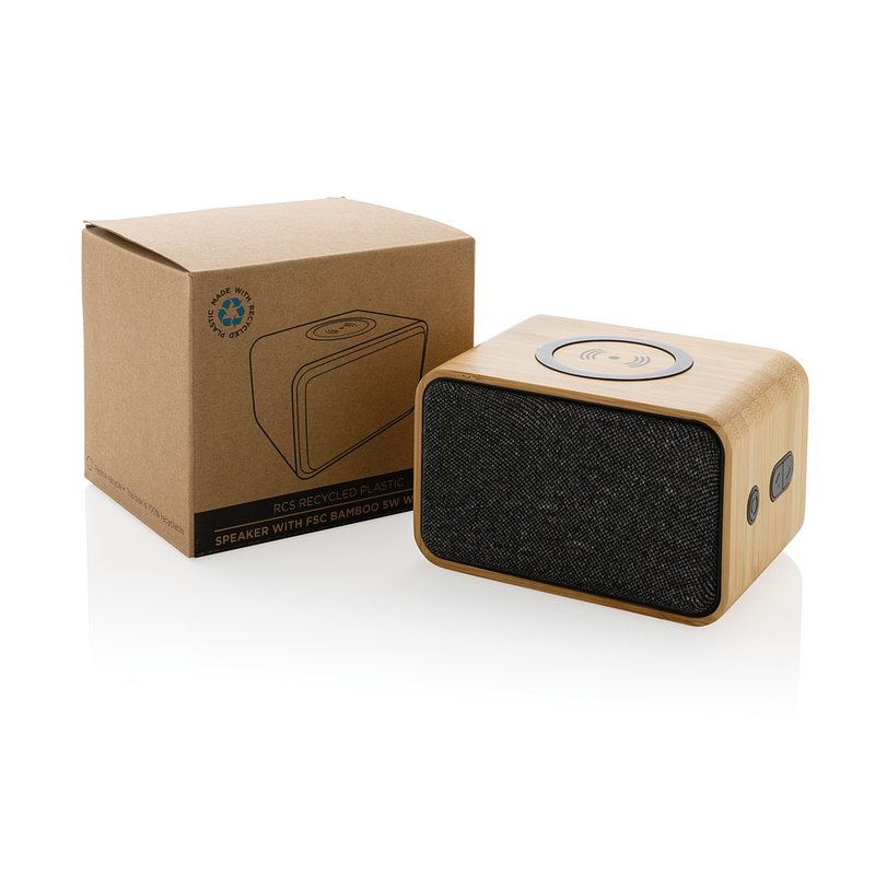 Altavoz inalámbrico de 3W con cargador inalámbrico de 5W integrado en la parte superior. Fabricado con exterior 100% bambú FSC®, ABS y PET reciclados con certificación RCS (Recycled Claim Standard). Contenido reciclado total: 37% basado en el peso total del artículo. La certificación RCS garantiza una cadena de suministro completamente certificada de los materiales reciclados. El altavoz está equipado con una batería de 1200 mAh para garantizar hasta 5 horas de tiempo de reproducción y BT5.0 para una conexión fluida y un sonido claro. Rango de conexión de hasta 10 metros. Con micrófono y función de descolgar para contestar llamadas. Presentado en caja kraft mixta FSC. Incluye cable de carga de TPE reciclado certificado GRS de 100 cm. Artículo y accesorios 100% libres de PVC.